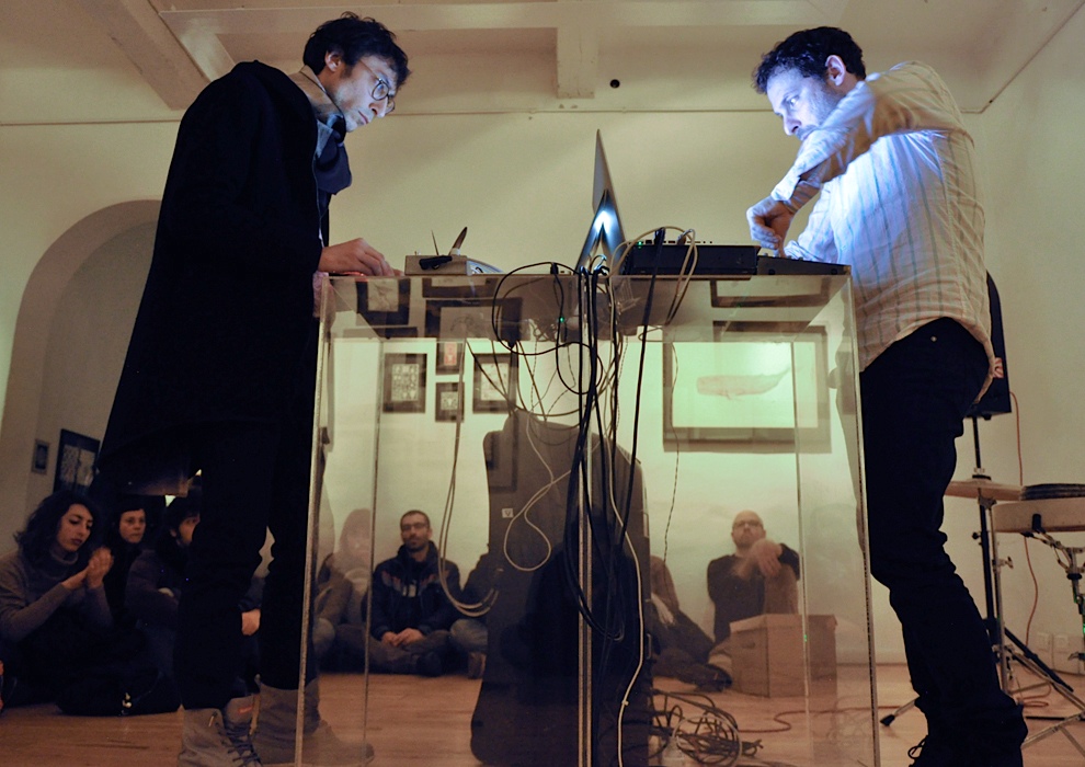Gio: I have always felt it was important trying to maintain at least a minimum of “physical” approach, even when the instruments being played permit little or nothing (read: everything electronic), through the use of external controllers (which I use anyway, to simplify the unfolding of events and to be able to act on more than one parameter simultaneously); the risk is to seem a clerk at the desk checking email. I must admit though that sometimes the presence of the performer is essentially useless, so much that you often try to reduce it to a minimum, playing in the dark or even not visible, staying (hidden) behind the scenes for example. It all depends on the type of project that is being developed. Regarding Lemures our presence is really useless, indeed almost “harmful”, because it could divert attention from what we’re trying to create: a landscape (exclusively) of sound, a “sound-fiction”every listener can place within his background. And truly here, the view should not be desired, but better excluded.