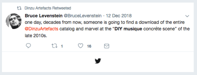 Although Dinzu is primarily a tape label, making it easy and affordable to collect, McKay is interested in formal experimentation taking the label in new directions, and some 10″ lathe cuts are currently planned for the not too distant future. As you might expect from a label with “artefacts” attached, McKay has a soft spot for collecting, and this is reflected in the attention given to Dinzu’s art and packaging. While each tape is limited to a relatively small edition, all of the Dinzu releases are accompanied by a digital download code and can be streamed at Bandcamp.
