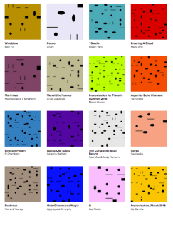 Gowing created a typographic language in which each letter is substituted for a symbol consisting of combinations of lines and dots of different kinds. See, for example, the beautiful simplicity of Lee Noble’s Q or Ekin Fil’s Windblow, each with relatively few characters on the cover due to the economy of the titles. Compare this with lengthier titles, Alison Cotton’s Behind the Spiderwood Gate or Laura Luna Castillo’s Cepheid Variables, which look like an alien game of dominoes.