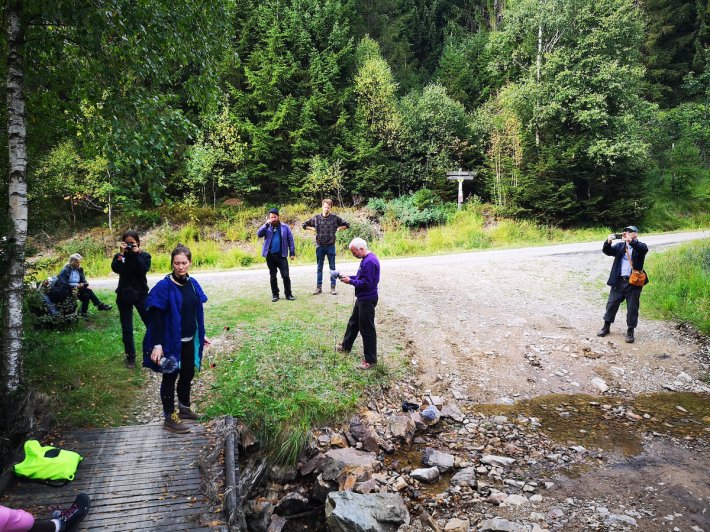 There is no “hard border” in the area, which has changed hands numerous times and been the site of much hostility. Today it is a calm, in-between land, home to myriad non-human species who certainly wondered what all the fuss was about. As part of the wider Natura 2000 network, the park is home to endangered species and protected habitats. Visitors must tread lightly, although no such protections have been extended to audio pollution, a challenge to the recordists. But this doesn’t stop them from having a bit of fun, as heard in a segment of clanks and clunks, later culminating in what sounds like a marble being rolled across the floor. It’s as if the team (seen below) are experimenting with making music of their own before giving in to the music already present.