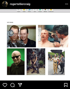 During the summer of 2020, Roger Tellier-Craig created an Instagram account consisting solely of behind-the-scenes photos of movie creature effects. These are photos that are jarring, even surreal, because they make the artifice of the medium plain to see. Tellier-Craig loves these kinds of moments. A favorite saying of his is “La réalité qui bascule dans le néant,” he explains, the moment when reality breaks down. This idea comes up multiple times throughout our conversation, a feeling exacerbated by the hyperreality of the ongoing pandemic. The contradiction, between the mundane normalcy of being at home and the ongoing severity of the situation, leads to these moments of recognition in which the ground seems to drop out from under us, like a waking hypnic jerk.