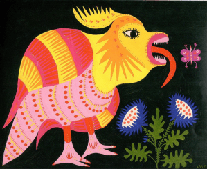 Young magpie catches a grub by Mariya Oksentiyivna Prymachenko