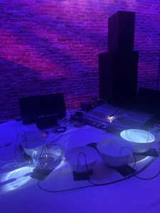 Somewhat unusually, of the second night’s six artists, half featured live performance elements. Devon Hansen, who some listeners might know as part of the improvising trio with Karl Fousek and Roger Tellier-Craig, closed the evening with a live improvisation for modular synth. In a very different register, Tomoko Sauvage channeled pure magic from her bowls of water, subtly playing with resonant frequencies and drops of water whose sonic manifestations transcend their mundane origins. Also choosing to perform live rather than diffuse a fixed work, Nicola Ratti performed a live interpretation of k1/k2, a work for modular synthesizer and tape loops originally released by Longform Editions. Ratti’s work has a level of groove that is often missing from electroacoustic music, grounding the exploration of timbre and tone. As the composition was winding down, Ratti slowly walked around the audience, most of whom couldn’t see him, slowly playing a simple rhythm on a wood block. Bellows, the duo of Ratti and Giuseppe Ielasi, ends their performances with the sound of the unamplified tape loops from the show playing back on portable cassette players. The effect is similar, but Ratti’s use of unamplified percussive gestures allowed him to sound out the space in quite a different way than, but in dialogue with, the multichannel system diffusing his modular loops. After nearly 20 minutes of tuning our ears to the spatialized sound of this multi-million dollar system, there was something refreshing about a simple woodblock moving through physical space.