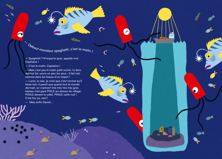 Daddy will of course come looking; in “Où se cache Daniel?” he seems to turn over every shell, shelf and coin with a crash. The effect is more playful than perilous; the reader knows where Daniel is. And if “Lucio le poisson de nuit” (“Lucio the night fish”) sounds like a lullaby, it also sounds like the wonder of a fish who carries her own night light.