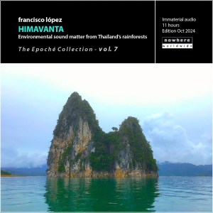 HIMAVANTA begins with a “short version;” 52:49 of sounds that cover all the bases of the longer version. This operates as an overture, opening windows to the listener. These field recordings were made in 2022 during Thailand’s monsoon season, when the artist travelled to multiple rain forests. Only occasionally does one hear the hand of López as he makes sonic choices: an unnatural shift here and there, a turn in the timbre. These are more apparent in the short version, by necessity. In the fifth minute, the sound of insects gives way to water, birds and (we think) monkeys, what one might call a classic rainforest biophany. One might view the different rain forests as songs, the short version as a medley; but it is also a story, as López chooses where each square of the sonic quilt will rest.