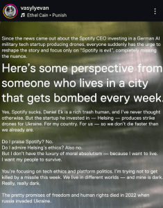 Tellingly, the debate revolves mostly on what the best streaming services might be, rather than engaging on the actual topic of drones. Instead of scrutiny into Helsing’s ethical claims, calibrated on the Economist’s democracy index, critics prefer to conflate Ek with AI warfare, facial recognition, ICE and the Trump administration, turning this into a US centric argument. The fact that the Spotify crusade is led by bands that seem to justify, or at least explain, Russia’s invasion of Ukraine as a response to Nato expansionism highlights how ideological the issue has become.