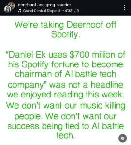 Criticism of Spotify has long been rife in the blogosphere. “Being on a streaming platform that pays musicians so unfairly has always been annoying, but somehow I could live with it,” is a typical example (@thebluesagainstyouth) generally followed by a variation on the following, “Daniel Ek’s investments in AI weapons cross a line for me” (@sleeppartypeople).