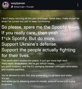 We have never been great fans of Spotify here at ACL either, but for Ukrainians who are trying to survive and have seen the delivery of Patriot Systems being halted, only to be resumed a few days later in the now customary Trump’s decision making roller coaster, this moral outrage is possibly misplaced.
