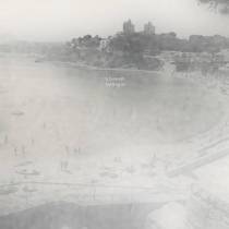 A hazy black and white photo of a beachfront scene, with bathers in clusters, on shore and in the water. Is this a vacation photo from a bygone era? A decaying artifact from a long-lost film? The cover of k.burwash’s